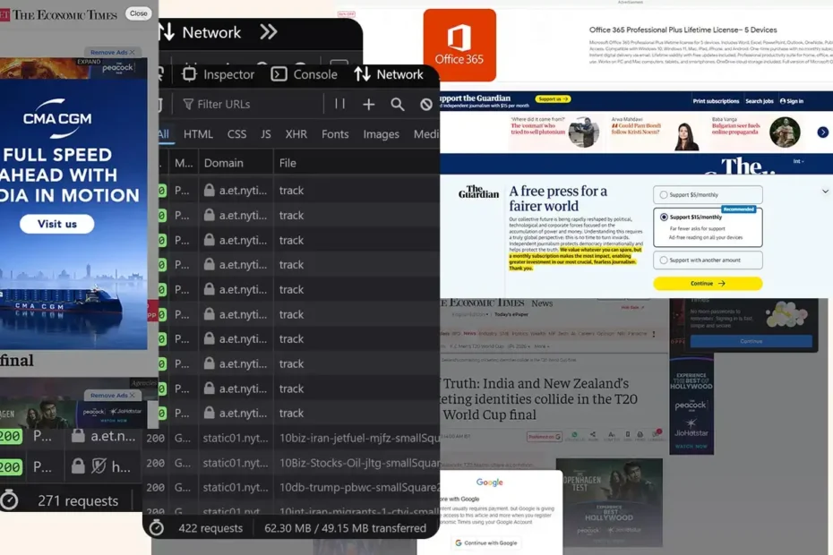 I went to the New York Times to glimpse at four headlines and was greeted with 422 network requests and 49 megabytes of data. It took two minutes before the page settled. And then you wonder why every sane tech person has an adblocker installed on systems of all their loved ones.